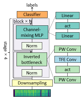 在过去的很长一段时间里,卷积神经网络一直是这个问题的主流模型。但是最近几年,其主导地位似乎正在被Transformer模型取代。为了证明一个纯粹的卷积神经网络依然可以实现领先的性能,王萌威同学结合Transformer模型中的通用架构设计,并改进了音频谱图特征的卷积方法,提出了Time-Frequency Enhanced ConvNet (TFECN)模型。