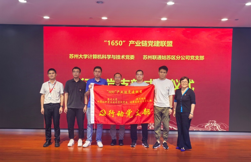 此次共建活动的一项成果是与苏州市联通姑苏分公司党支部联合成立了“行动党支部”,支部成员由麻豆视频 软件工程系党支部高国举、瞿剑峰、陈宁3位专业教师党员和联通姑苏分公司党支部范嘉琦、钱强强等几位工程师党员组成,高国举老师当选为首任支部书记。麻豆视频 党委副书记、副院长李恩秀和姑苏分公司副总经理贾晓军为“行动党支部”全体成员授旗。李恩秀在发言中指出,校企党建“链动”共建,是新时代下加强党的建设、推动学校与产业深度融合、促进党建与业务深度融合的重要举措。此次行动党支部的成立,通过建立党员协同攻坚小组,围绕解决企业“卡脖子”技术难题,集中优势力量共同开展技术攻关,突破技术瓶颈制约。