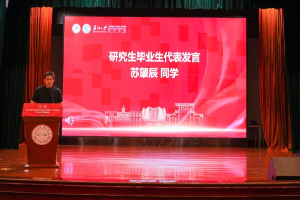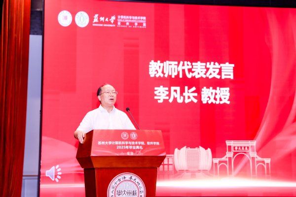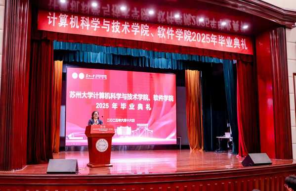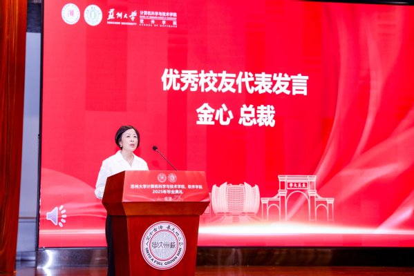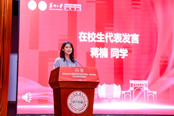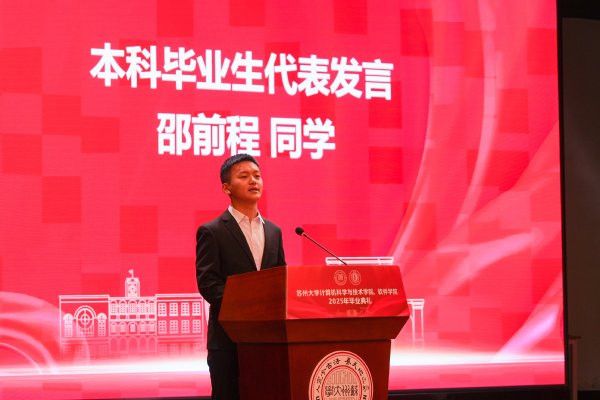 2021级计算机科学与技术专业的邵前程同学作为本科毕业生代表发言,他回顾了从初入校园的青涩到即将走向社会的成熟蜕变,同时表达了对学院和老师悉心培养的感激,并鼓励同学们不忘初心,勇敢迎接未来的挑战。2022级计算机科学与技术专业硕士研究生苏肇辰同学作为研究生毕业生代表发言,他分享了在校期间的学习和科研感悟,并号召同学们铭记“养天地正气、法古今完人”的苏大校训,在未来的工作和生活中继续发挥专业所长,为社会贡献力量。2023级人工智能专业的蒋楠同学作为在校生代表发言,她向即将毕业的学长学姐送上诚挚的祝福,感谢他们的榜样力量,并表示将传承他们留下的“精神代码”,在今后的学习中不断努力,砥砺前行。麻豆视频 1988级校友金心作为优秀校友代表发言,金心总裁结合自身成长与职业发展的经历,勉励学弟学妹们在新时代的广阔舞台上善于抓住机遇,在不断奋斗中成长为勇担时代使命的有为青年。学院李凡长教授作为教师代表发言,李教授以一个富有创意的数学公式为引,从不确定性、可持续性、复杂性与稳定性四个角度,寄语毕业生们坚定信念、勇敢前行、持续进步、追求平衡。随后,毕业生代表顾斯佳和孙家杨向学院赠予礼物,以此表达对学院辛勤培育的感激之情。