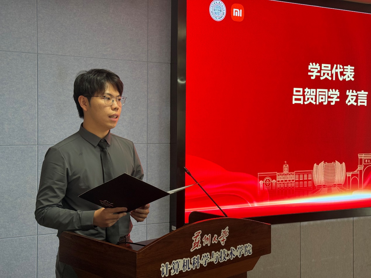优秀学员代表吕贺在发言中表达了对学校和小米集团的诚挚谢意。他表示,在为期十五天的密集训练中,同学们经历了从理论到实践再到收获的飞跃,工程实践能力与理论认知均得到显著提升。他生动描述了学员们克服困难、挑灯夜战的拼搏精神,以及小米导师团队倾力投入、全程陪伴的专业指导。这段经历不仅提升了技术能力,更让大家深刻体会到作为新时代青年的责任担当:以钻研精神筑牢科研根基,用创新实践回应国家需求。