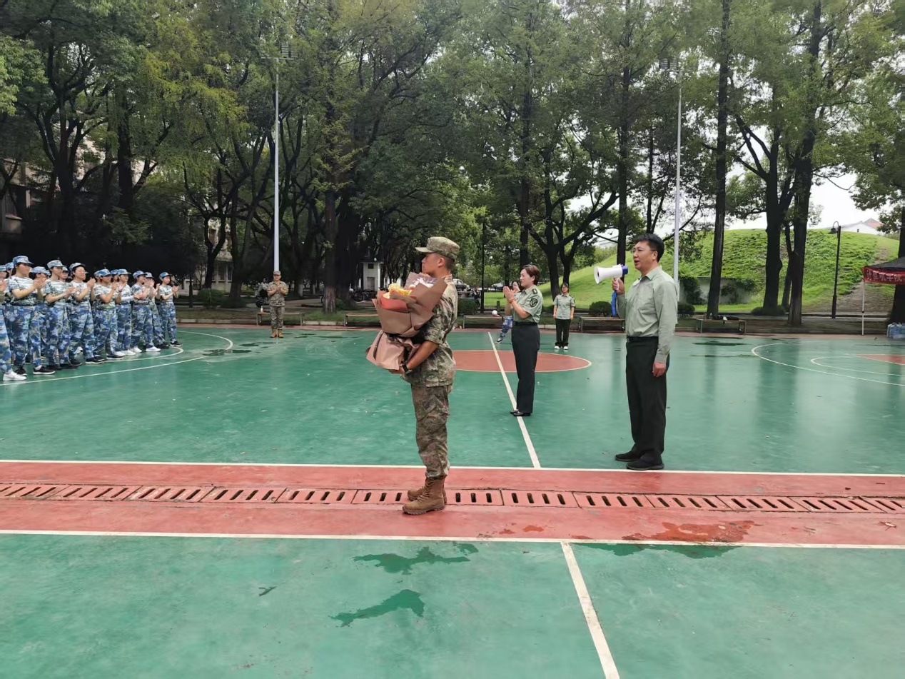 连日高温为军训带来严峻挑战,多名参训学生及一位教官因在烈日下持续训练出现中暑症状。警报声中,训练暂停,师生肃立。董召勤详细了解他们的身体恢复情况,充分肯定了教官恪尽职守的精神与学生意志坚韧的品质。宋海英特别为带病坚持训练的教官送上鲜花,对其致以诚挚的慰问与敬意,并反复叮嘱学生务必科学施训、防暑降温,将健康安全放在首位。