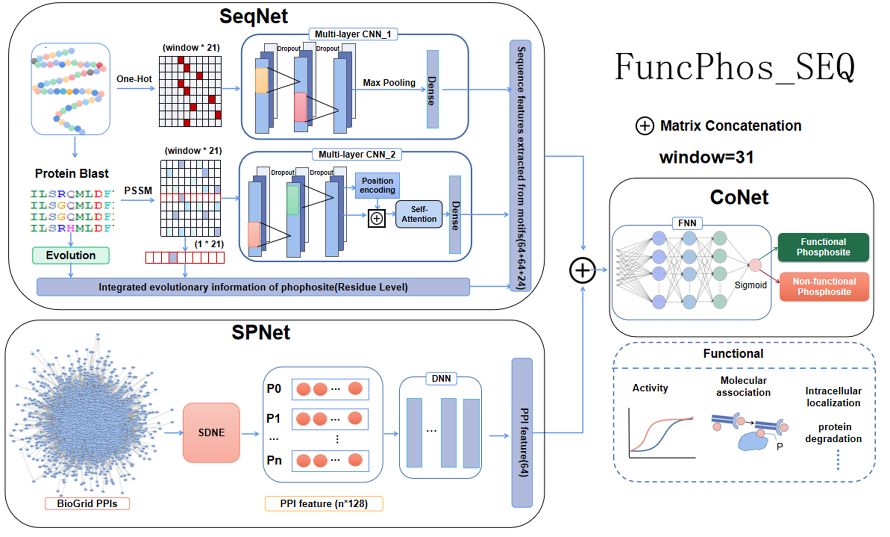 通过检索PSP、EPSD、iPTMnet以及PTMD数据库收集了人类具有功能磷酸化位点的3335个蛋白质及135063个磷酸化位点。其中,带有功能注释的磷酸化位点有9769个。根据PSP数据库的注释,功能磷酸化位点的作用包括蛋白质分子功能的调控、参与生物过程以及大分子间互作。通过多序列比对分析发现功能性磷酸化位点具有较高的保守性及一定的共演化特征;同时,具有功能性磷酸化位点的蛋白质在蛋白质—蛋白质互作(PPI)网络中具有较高的连接度、介数等网络拓扑参数,表明PPI网络拓扑在磷酸化位点发挥功能中具有不可忽视的作用。基于功能性磷酸化位点的特征统计,研究团队提出了一种基于蛋白质序列和PPI信息的人类蛋白质组水平的磷酸化位点功能预测的深度学习框架FuncPhos-SEQ。