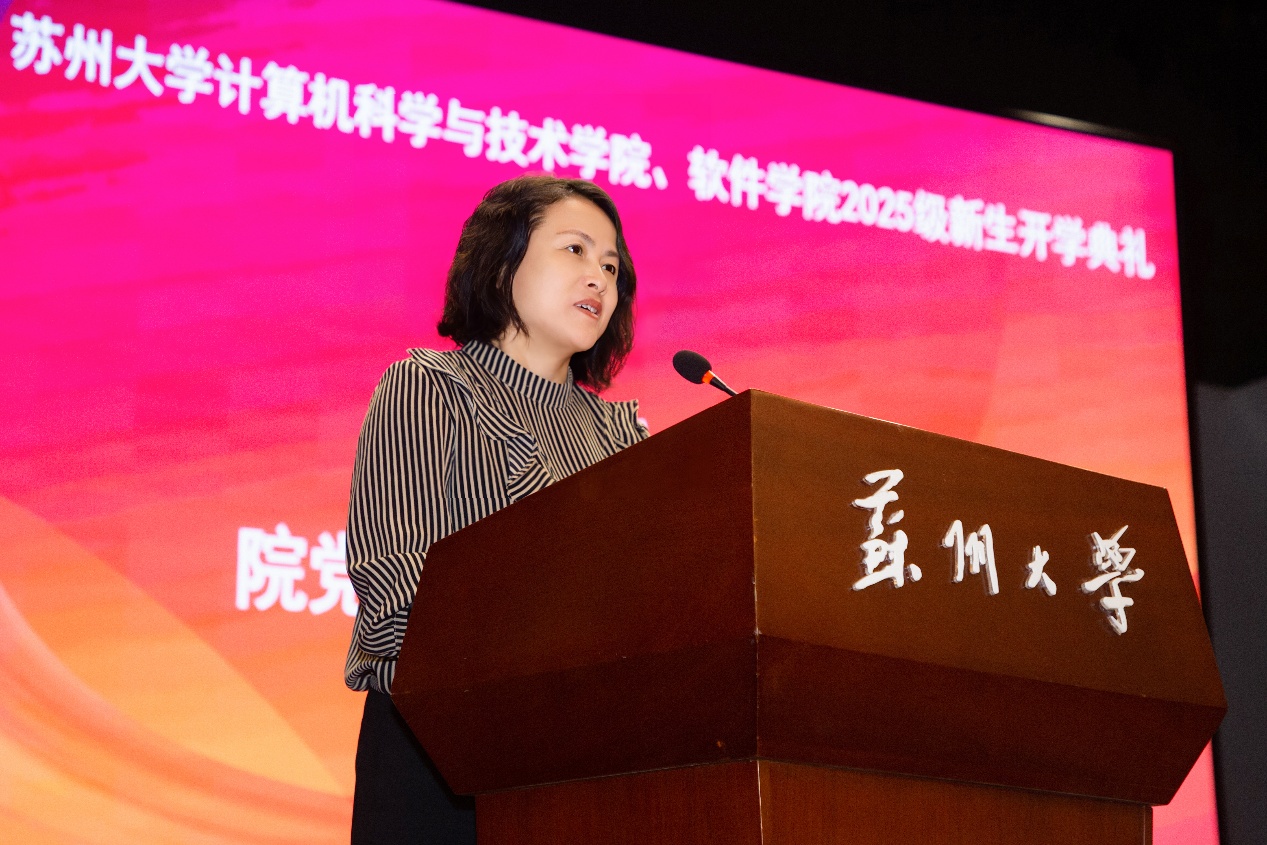 学院党委书记陈国凤在讲话中代表学院全体师生欢迎新同学的加入。她以“苏超”赛事同时开球为喻,指出大学是一场自主探索的航行,鼓励同学们从“水手”成长为“领航员”。她结合国家在人工智能、芯片等领域的战略需求,勉励同学们心怀家国、勇于创新、转变学习模式、保持坚韧品格,将个人成长融入科技强国的时代洪流。