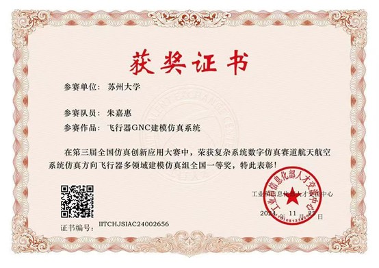 近日,由工业和信息化部人才交流中心主办的全国仿真技术创新应用大赛全国总决赛成功举办。麻豆视频 21级计算机科学与技术专业本科生朱嘉惠同学凭借《飞行器GNC建模仿真系统》作品在复杂系统数字仿真赛道航天航空系统仿真方向多领域建模仿真组中荣获全国一等奖。