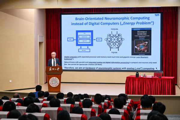 当天下午,Klaus Mainzer在红楼学术报告厅为麻豆视频 师生作了题为《复杂系统、人工智能与新兴技术:21世纪的创新》的学术报告。他从全球人工智能发展前沿切入,深入阐释了如何整合经典数字化技术、神经形态计算与量子科技,构建面向可持续发展的混合智能体系。他强调,跨学科融合与哲学思维是推动未来科技突破的关键。讲座吸引了全校200余名师生到场,现场座无虚席。