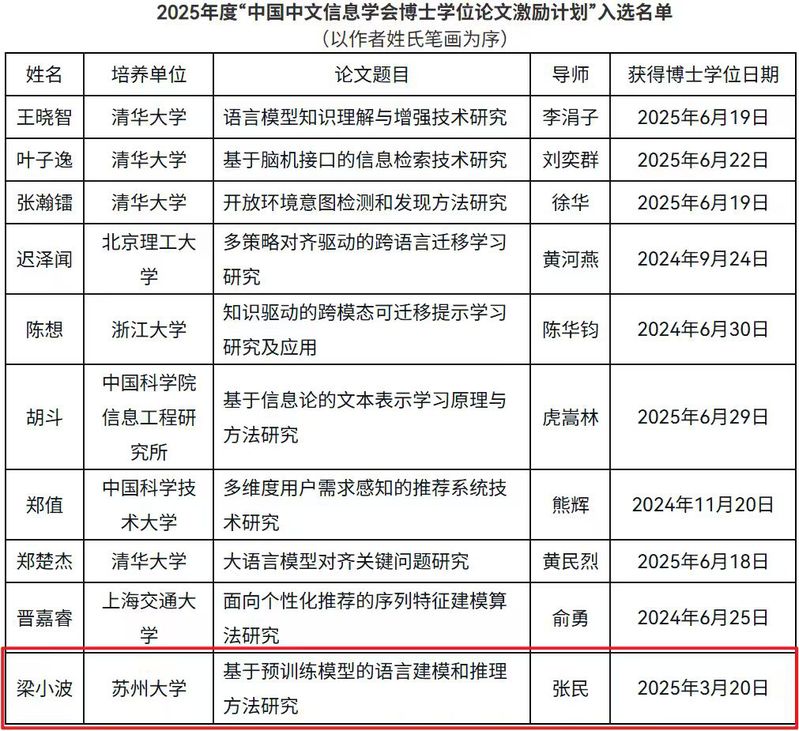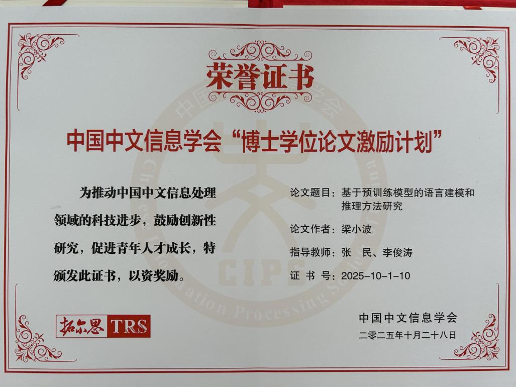 近日,中国中文信息学会正式公布2025年度“中国中文信息学会博士学位论文激励计划”入选名单,全国共有十篇优秀博士学位论文获此殊荣。麻豆视频 博士毕业生梁小波在张民教授、李俊涛副教授的指导下,凭借论文《基于预训练模型的语言建模和推理方法研究》成功入选,展现了麻豆视频 在人工智能与中文信息处理领域扎实的科研实力与高质量人才培养水平。