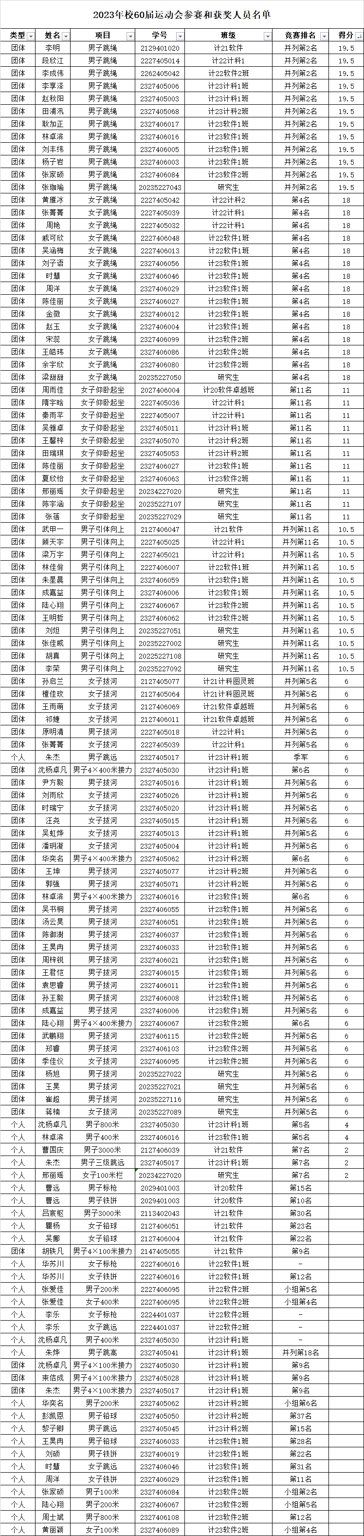 关于公布和表扬学院校运动参赛和获奖人员的通知
